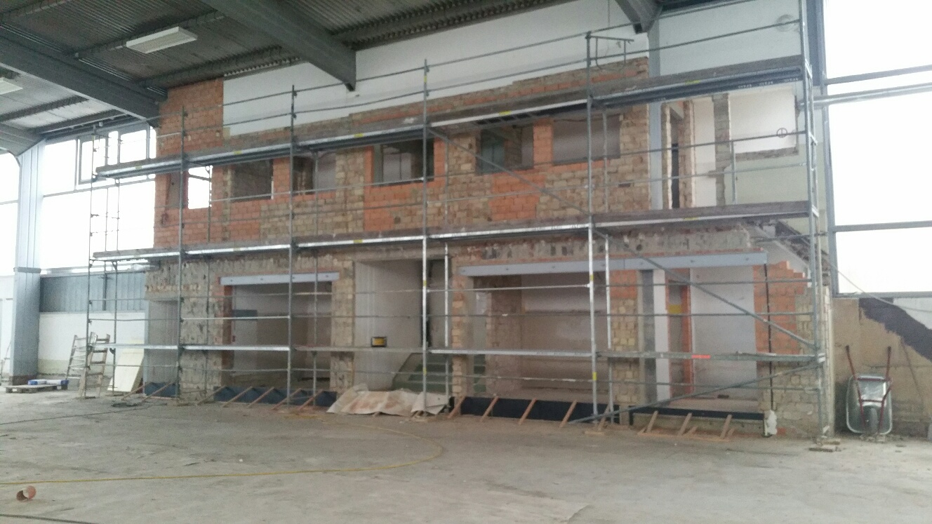 Mittlerweile sind die Maurerarbeiten und die notwendigen neuen Strom- und Netzwerkverkabelungen abgeschlossen. Kopfzerbrechen bereitete zwischenzeitlich eine komplett verstopfte und damit nicht mehr nutzbare Wasserzuleitung. Diese musste neu aus dem Anbau der Halle herangeführt und installiert werden, aber auch dies ist nun erledigt. Dazu gab es eine neue Auflage seitens der Behörden, dass die Treppe zur oberen Etage zu erneuern sei, da die bisherige in Sachen Steigung und Stufung keinerlei Norm entsprach.