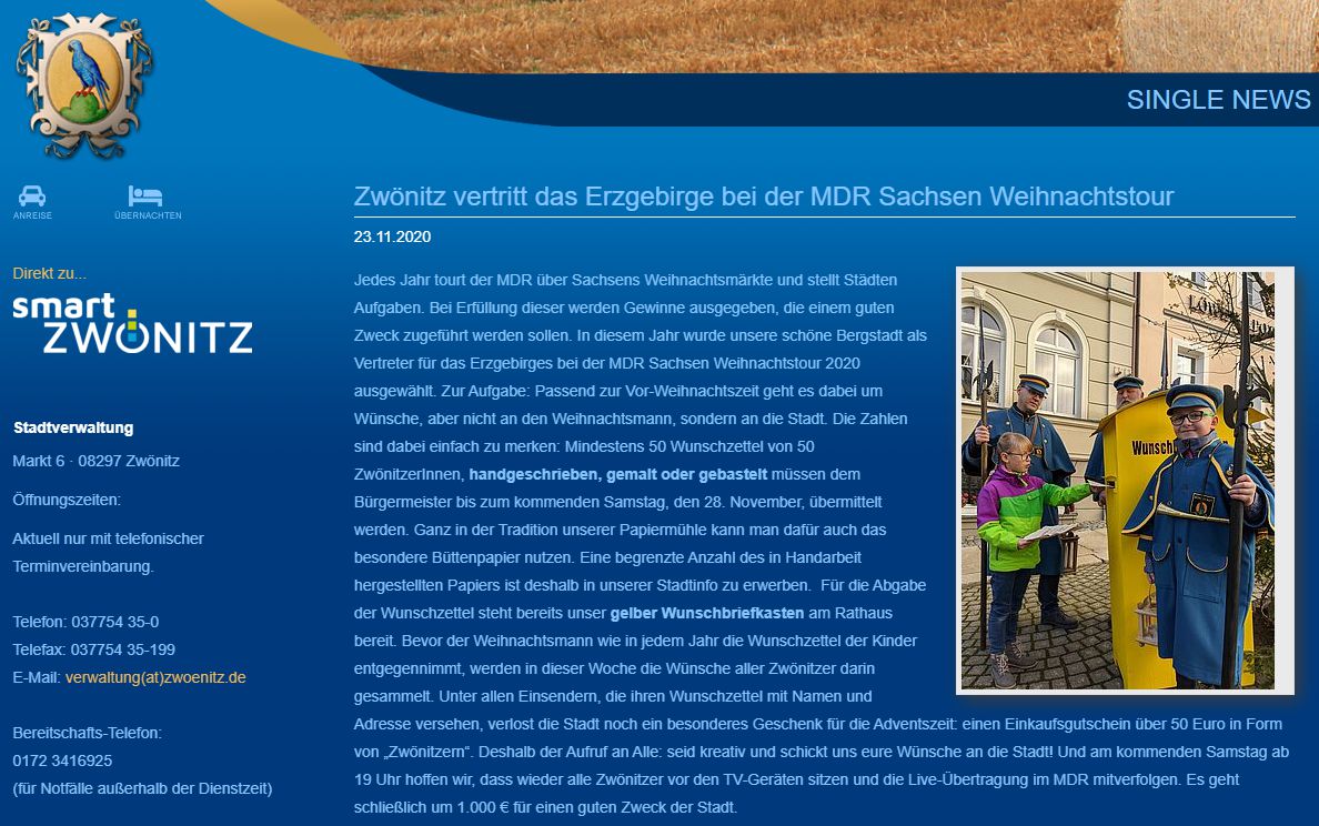 Auf seiner alljährlichen MDR Sachsen Weihnachtstour hat der Mitteldeutsche Rundfunk in 2020 tatsächlich unser wunderschönes Zwönitz entdeckt und hier gleich am ersten Adventswochenende halt gemacht.